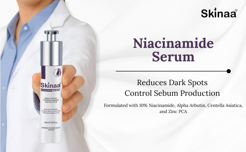 With the goodness of 10% Niacinamide, Centella Asiatica, Zinc PCA & Alpha Arbutin, and the trust of dermatologist-formulated care, Skinaa Niacinamide Serum is your daily ally against pores, oiliness, dark spots, and sensitivity — giving you healthy, radiant, and even-toned skin.