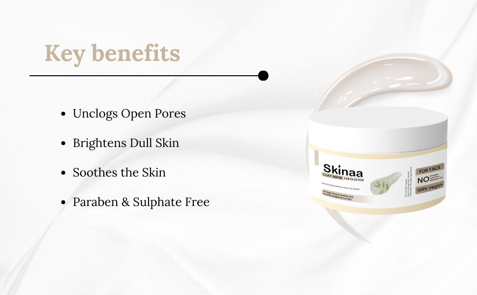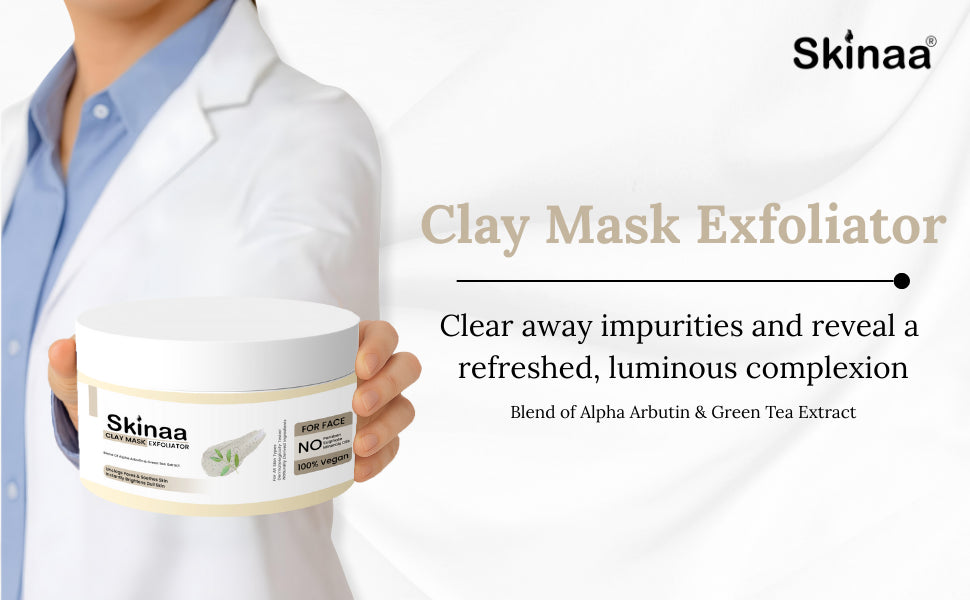 Give your skin the ultimate detox with Skinaa Clay Mask Exfoliator, a 100% vegan, chemical-free clay face mask designed to unclog pores, remove impurities, and brighten dull skin. Enriched with Green Tea Extract, Aloe Vera, and natural clays, this gentle exfoliating mask deeply cleanses while soothing and refreshing your skin, leaving it smooth, radiant, and glowing. Perfect for men, women, and teens, it’s a dermatologist-tested face mask for all skin types.
