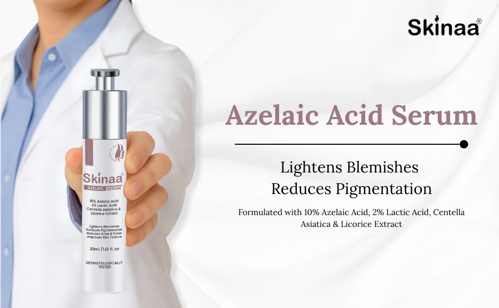 Discover clear, radiant skin with Skinaa Azelaic Acid Serum, a dermatologist-tested serum formulated with 10% Azelaic Acid and 2% Lactic Acid, boosted by Centella Asiatica and Licorice Extract. This powerful yet gentle formula helps reduce acne, lighten pigmentation, and improve overall skin texture — making it an essential daily serum for acne-prone and uneven skin.