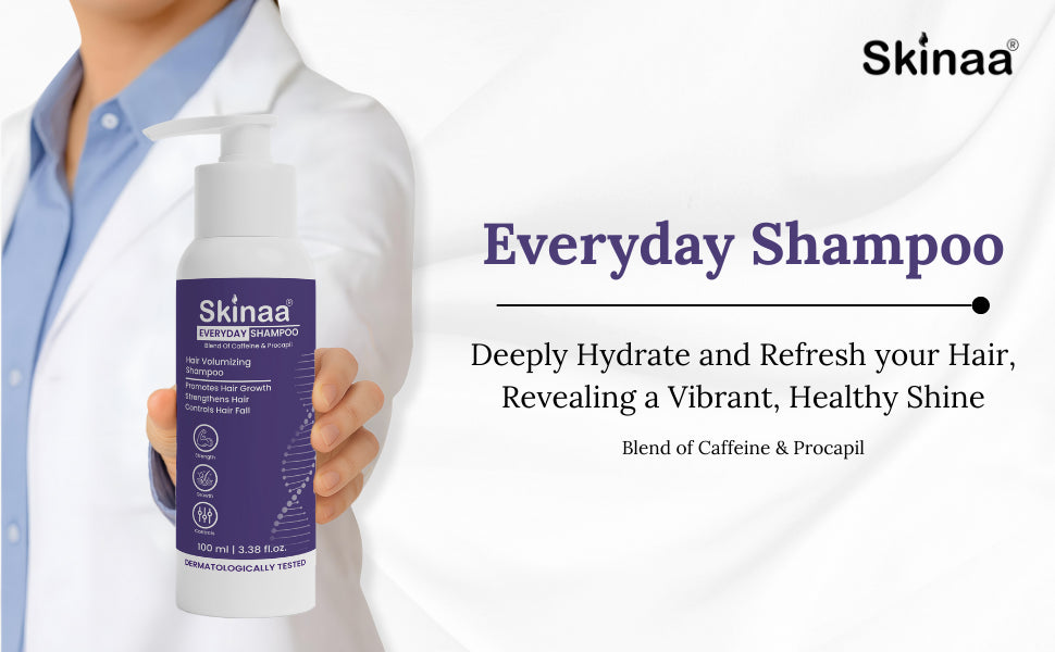Healthy hair starts with the right daily care. Skinaa Everyday Shampoo is a dermatologist-tested, sulphate-free formula enriched with Caffeine and Procapil, designed to gently cleanse, nourish, and strengthen hair from root to tip. Perfect for men and women, it helps control hair fall, supports regrowth, and adds natural volume — making it the ideal everyday shampoo for stronger, fuller, and healthier hair.