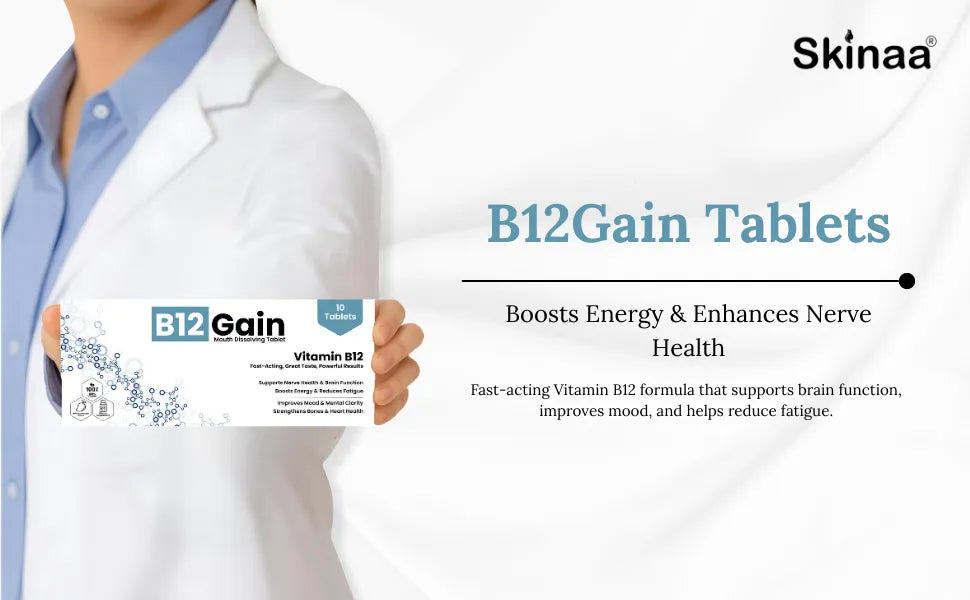 Skinaa B12 Gain Tablets are expertly formulated with Vitamin B12 (1500 mcg), Vitamin D3 (1000 IU), L-Methylfolate (1 mg) and Pyridoxal 5-Phosphate (0.5 mg) to support daily energy, nerve function, and mental clarity.
