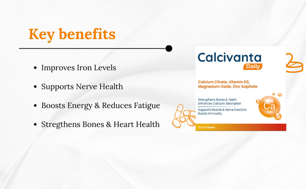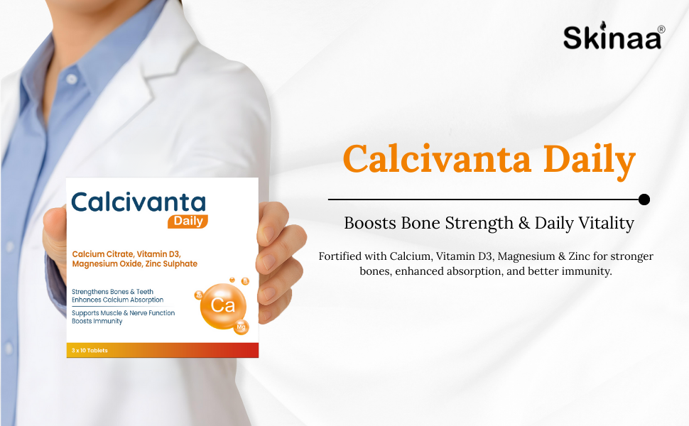 Skinaa Calcivanta Daily Tablets are specially formulated with Calcium, Vitamin D3, Magnesium, and Zinc to help strengthen bones and teeth while improving overall vitality. The formula enhances calcium absorption, supports nerve and brain function, and helps maintain strong immunity and joint flexibility.