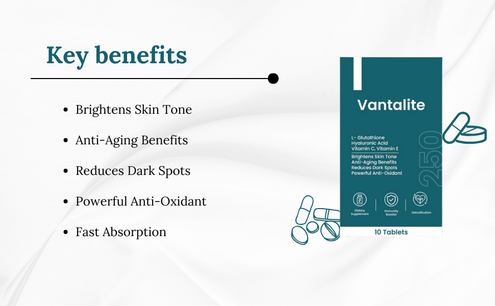Vantalite 250mg glutathione tablets for pigmentation & skin glow – Targets dullness & uneven tone.