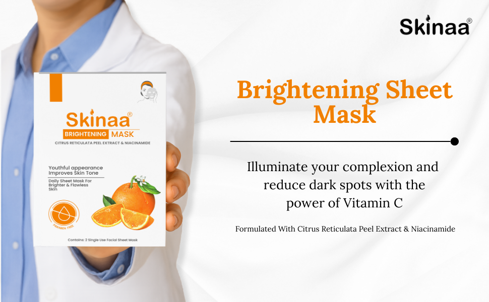 Skinaa Brightening Sheet Mask is a premium quality, dermatologically formulated facial sheet mask designed to improve skin tone and enhance overall radiance. Enriched with Citrus Reticulata Peel Extract, known for its brightening and revitalizing properties, and Niacinamide, which helps support even-looking skin tone, this mask works effectively to refresh dull, tired skin.