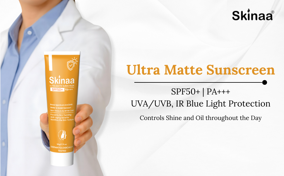 Skinaa Matte Sunscreen PA+++ – Broad-spectrum protection against UVA, UVB, IR & blue light.